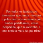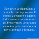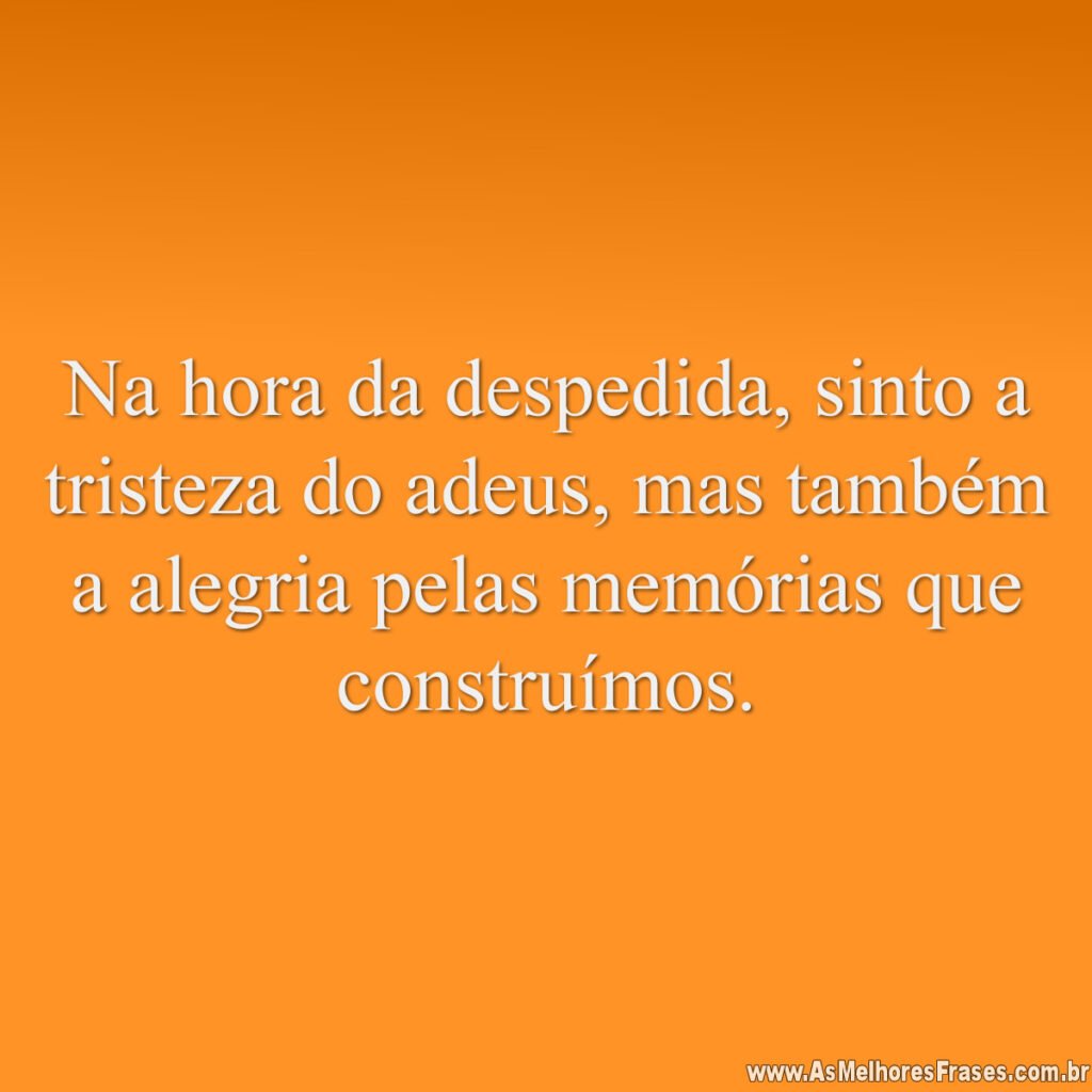Home Frases de Despedida Na hora da despedida, sinto a tristeza do adeus 5 anos ago 5 anos agoFrases de DespedidaNa hora da despedida, sinto a tristeza do adeus by Fabio Anesio 0 0shares Facebook TwitterNa hora da despedida, sinto a tristeza do adeus, mas também a alegria pelas memórias que construímos.Like it? Share with your friends! 0 0shares Facebook Twitter Inscrever-se AcessarNotificar de novos comentários de acompanhamentonovas respostas aos meus comentários Label {} [+] Nome* Email* Website Label {} [+] Nome* Email* Website 0 Comentários Mais votado mais recentes mais antigos Feedbacks embutidosVer todos os comentários Previous Post Por todos os fantásticos momentos by Fabio Anesio Next Post Não gosto de despedidas e nem acho que seja o... by Fabio Anesio