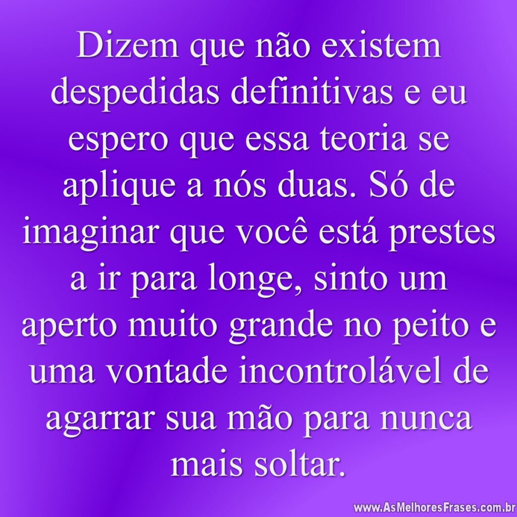 Dizem que não existem despedidas definitivas e eu espero que essa teoria se aplique a nós duas. Só de imaginar que você está prestes a ir para longe, sinto um aperto muito grande no peito e uma vontade incontrolável de agarrar sua mão para nunca mais soltar.