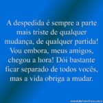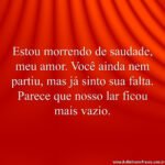 Home Frases de Despedida Ausência física, ausência da voz e do cheiro 5 anos ago 5 anos agoFrases de DespedidaAusência física, ausência da voz e do cheiro by Fabio Anesio 0 0shares Facebook TwitterAusência física, ausência da voz e do cheiro, das risadas e do piscar de olhos, saudade da amizade que ficará na lembrança e em algumas fotos. – Martha MedeirosLike it? Share with your friends! 0 0shares Facebook Twitter Inscrever-se AcessarNotificar de novos comentários de acompanhamentonovas respostas aos meus comentários Label {} [+] Nome* Email* Website Label {} [+] Nome* Email* Website 0 Comentários Mais votado mais recentes mais antigos Feedbacks embutidosVer todos os comentários Previous Post Estou morrendo de saudade by Fabio Anesio Next Post A despedida é sempre a parte mais triste de qualquer... by Fabio Anesio