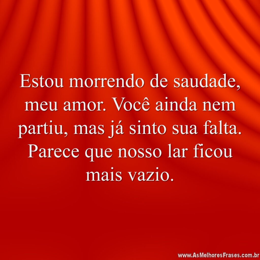 Home Frases de Despedida Estou morrendo de saudade 5 anos ago 5 anos agoFrases de DespedidaEstou morrendo de saudade by Fabio Anesio 0 0shares Facebook TwitterEstou morrendo de saudade, meu amor. Você ainda nem partiu, mas já sinto sua falta. Parece que nosso lar ficou mais vazio.Like it? Share with your friends! 0 0shares Facebook Twitter Inscrever-se AcessarNotificar de novos comentários de acompanhamentonovas respostas aos meus comentários Label {} [+] Nome* Email* Website Label {} [+] Nome* Email* Website 0 Comentários Mais votado mais recentes mais antigos Feedbacks embutidosVer todos os comentários Previous Post Dizer adeus a um amor é cortar o coração aos... by Fabio Anesio Next Post Ausência física, ausência da voz e do cheiro by Fabio Anesio