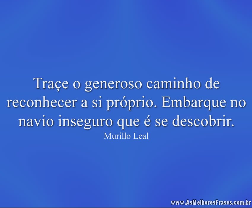 Home Frases de Timidez Traçe o generoso caminho de reconhecer a si próprio 8 anos ago 8 anos agoFrases de TimidezTraçe o generoso caminho de reconhecer a si próprio by Fabio Anesio 0 0shares Facebook TwitterTraçe o generoso caminho de reconhecer a si próprio. Embarque no navio inseguro que é se descobrir. – Murillo LealLike it? Share with your friends! 0 0shares Facebook Twitter Previous Post Não raras vezes, a vida nos coloca diante by Fabio Anesio Next Post Dizer “NÃO SEI” ou “PORQUE” das questões by Fabio Anesio