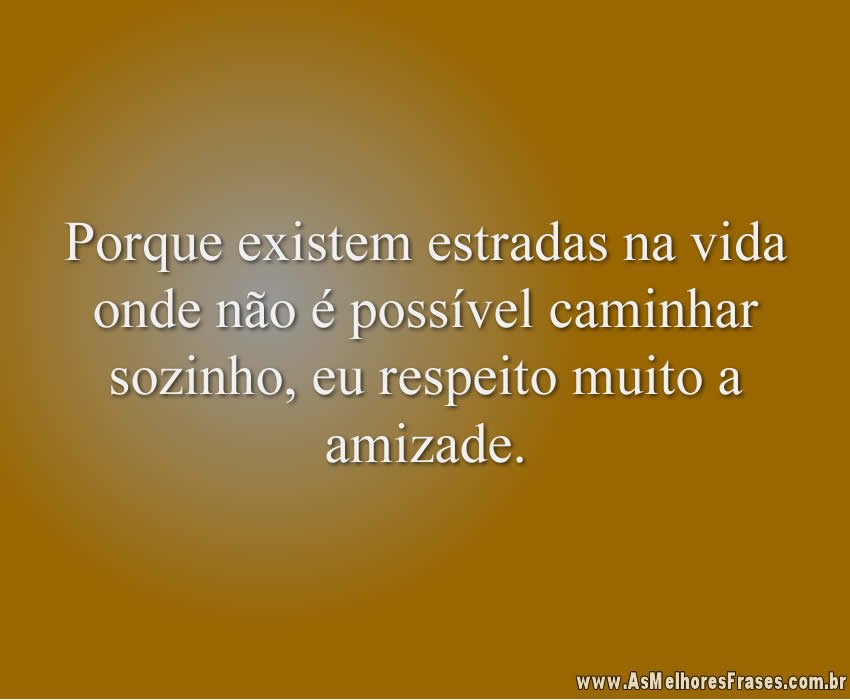 Home Frases de Respeito Porque existem estradas na vida 8 anos ago 8 anos agoFrases de RespeitoPorque existem estradas na vida by Fabio Anesio 0 0shares Facebook TwitterPorque existem estradas na vida onde não é possível caminhar sozinho, eu respeito muito a amizade.Like it? Share with your friends! 0 0shares Facebook Twitter Previous Post Casamentos fortes by Fabio Anesio Next Post A maior glória do Homem é respeitar a vontade by Fabio Anesio
